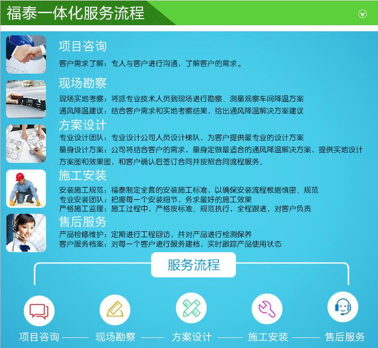 量身訂制水簾風機、環保空調 在這個新制作繁華的時代,我們的所有產品型號都是為客戶所生存著。我們是系統化量身為客戶訂制的廠房通風降溫設備,很多人說生意不好做,其實做任何一個行業都必須用心、對客戶負責。 今天說說福泰產品和安裝是個性化,如何把個性化的產品根據客戶廠房的標準化、訂制符合客戶要求的降溫通風幫客戶解決所解決的困難。 小編在此說兩句題外話,如果一個企業不能滿足80%的要求那么這個企業是失敗的。我雖然不懂但我們營銷人員經常分享也耳讀目染,所謂的量身訂做為客戶不是就局限了自己的業務板塊,而是策劃和產品方面的全面才能到達這一要求,簡單的舉例,如果你是毛絨玩具廠,那么我們的降溫策劃專員可能就會根據客戶的情況和車間的要求,來給予定位是安裝水簾風機還是環保空調優勢大來決定產品,那么如果定位在濕簾風機負壓對流降溫產品,通過營銷人員測量后安裝在什么位置,窗戶的大小、尺寸、風量、車間的換氣次數精算出多少平方的水簾搭配幾臺負壓排風機達到客戶需要的風壓和降溫效果等等。