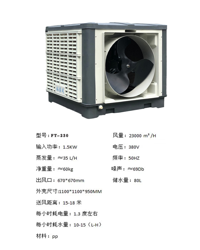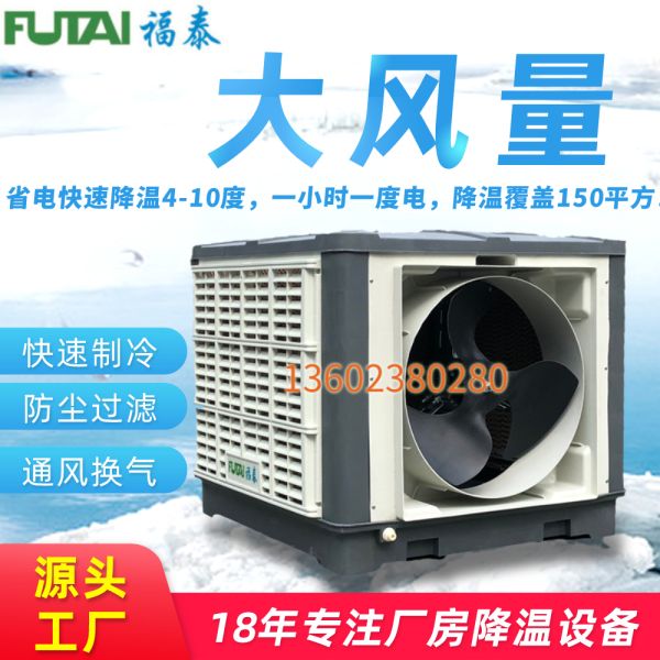 福泰環保空調有哪些特點呢? 投資少、效能大:在同等條件及面積安裝中央空調與蒸發式冷風機相比,蒸發式冷風機約是中央空調總投資的1/5。 耗電少、每小時用電約1度:在同等面積安裝中央空調與蒸發式冷風機,耗電量約只需中央空調的1/8。 空氣質量好:集通風、換氣、除塵、降溫于一體,增加空間含氧量,提高工作效率,整體送風或崗位送風隨意選擇。 降溫效果強:在南方地區,一般降溫達4℃~10℃的效果,在炎熱干燥地區,降溫達到4℃~15℃,并且降溫迅速。 風量大、送風遠:每小時最大風量為20000至80000立方米,可根據客戶要求選取,風壓大、送風遠。 性能穩定、質量可靠:采用100mm厚”5090蒸發濾網“蒸發效率高,降溫能力強。 調節濕度:對需要增加空氣濕度的工作場所進行濕度調節。 節能環保:綠色低碳,無污染,節能環保,使用壽命長! 福泰有很多不同功率的機型供客戶選擇: