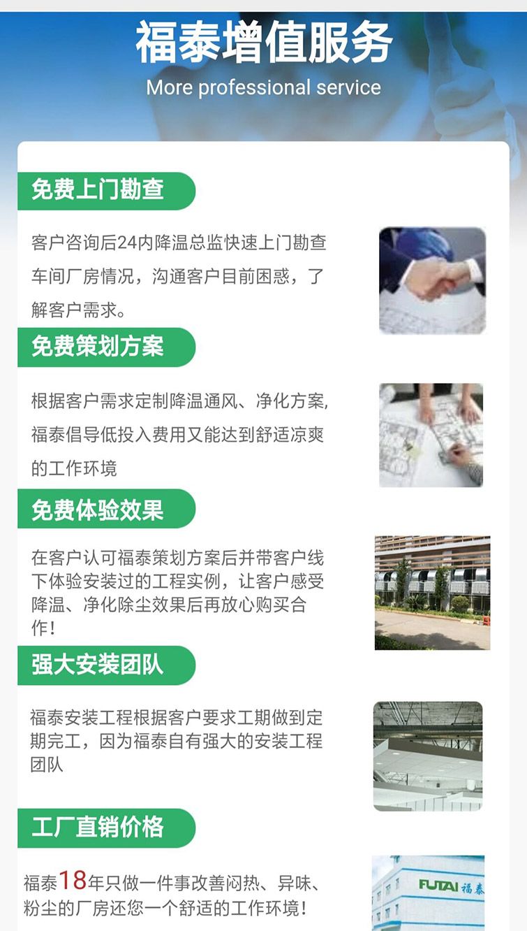 福泰環?照{一次性解決這些問題 降溫效果好:能夠迅速把室內的溫度降下來,一般可以比室外溫度降低4~12℃。 通風效果好:通風換風送風效果好,室內含氧量高。 去除異味效果好:能夠及時的排除及減低異味。 空氣凈化效果好:室內的空氣粉塵凈化效果好。 去除有害氣體效果好:能迅速把室內有害物質減少。