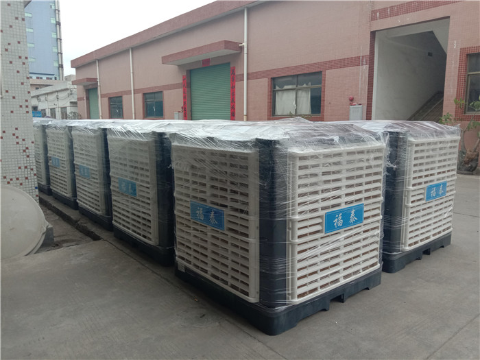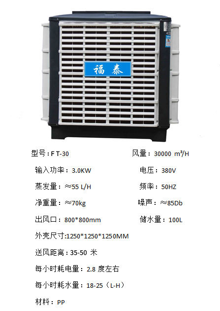 福泰環保空調有哪些特點呢? 投資少、效能大:在同等條件及面積安裝中央空調與蒸發式冷風機相比,蒸發式冷風機約是中央空調總投資的1/5。 耗電少、每小時用電約1度:在同等面積安裝中央空調與蒸發式冷風機,耗電量約只需中央空調的1/8。 空氣質量好:集通風、換氣、除塵、降溫于一體,增加空間含氧量,提高工作效率,整體送風或崗位送風隨意選擇。 降溫效果強:在南方地區,一般降溫達4℃~10℃的效果,在炎熱干燥地區,降溫達到4℃~15℃,并且降溫迅速。 風量大、送風遠:每小時最大風量為20000至80000立方米,可根據客戶要求選取,風壓大、送風遠。 性能穩定、質量可靠:采用100mm厚”5090蒸發濾網“蒸發效率高,降溫能力強。 調節濕度:對需要增加空氣濕度的工作場所進行濕度調節。 節能環保:綠色低碳,無污染,節能環保。