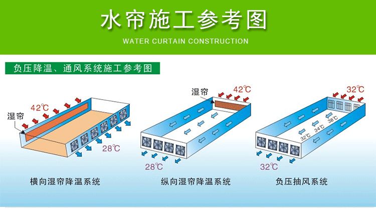 水簾、濕簾紙都有哪些型號7090濕簾厚度福泰降溫水簾7090:濕簾(水簾)降溫主要利用水蒸發過程中水吸收空氣中的熱量,使空氣溫度下降的物理學原理。在實際中于負壓風機配套使用,濕簾裝在密閉房舍一端山墻或側墻上,風機裝在另一端山墻或側墻上,降溫風機抽出室內空氣,產生負壓迫使室外的空氣流經多孔濕潤濕簾表面,使空氣中大量熱量進行轉化處理從而迫使進入室內的空氣降低4-10℃,并不斷的引入室內進行防暑降溫。水簾厚度主要有10公分、15公分、20公分三種,其中10公分使用最為廣泛。、降溫水簾的蜂窩孔直徑主要有5mm、7mm、9mm三種,7mm使用最為廣泛,5mm用于環保空調(冷風機),9mm用于灰塵過多容易堵塞的場所。按波紋夾角可分為45度+45度、30度+60度、45度+15度,水簾紙的型號有5090、5060、7090、6090、7060、9090、9060。降溫水簾常用的型號是7090,根據不同需要也可以制作成其他型號。 福泰濕簾風機的優點: 1.省電,一小時才一度電 2. 集通風,換氣,降溫于一體。 3. 節能:耗電量少,只需傳統空調的10%至15%左右。 4. 環保:不含氟里昂(CFC)。 5. 降溫效果佳:外界空氣經過降溫水濂進入室內后,在降溫水簾側的室內溫度可達到5-10度的降溫效果。 6. 投資回報率高,1至2年內可收回投資成本。 7.凈化室內空氣 8. 快速將室內的渾濁,悶熱及有異味的空氣替換排出室外。 9. 有效控制室內環境,在室內產生不同的風速,造成涼風效應,令人感到異常的舒適清爽。 10. 維修, 保養簡單方便