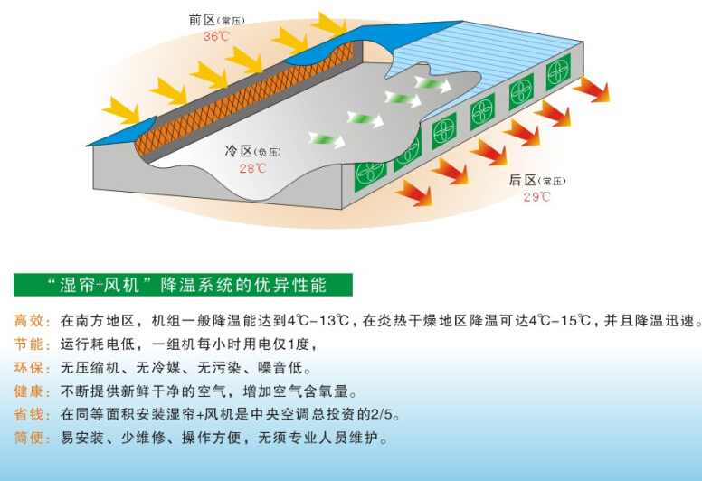 很多人都知道水簾可以降溫,那如果沒有負(fù)壓風(fēng)機(jī)的配合將施展不了它的價值了,今天來分享的是水簾降溫系統(tǒng)是怎么個降溫原理和水循環(huán)制造給工廠持續(xù)不斷廉價的冷氣輸送的。看下水簾降溫示意圖: