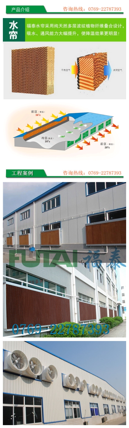 二、設備水簾風機安裝的位置選擇 1、從總體來說,設備最好選定安裝在建筑物的外墻,盡量縮短對流距離; 2、設備可安裝在墻面上、窗臺上,但安裝環境應保證空氣流暢清新,水簾不應裝在有臭味或異味氣體的排氣口處,如:廁所、廚房、化學物體排風口等。如果沒有足夠通風使用的窗或門,負壓通風要開設墻孔,保證廠房需求風量; 3、風機安裝在距地面1m~1.5m位置,使對流在適當的高度,創造清爽環境。 4、風機+水簾通風系統安裝方式一般有縱向和橫向二種。 5、要確保風機水簾系統的安裝位置處機架結構穩固,強度能支撐整個設備以及檢修人員的重量。