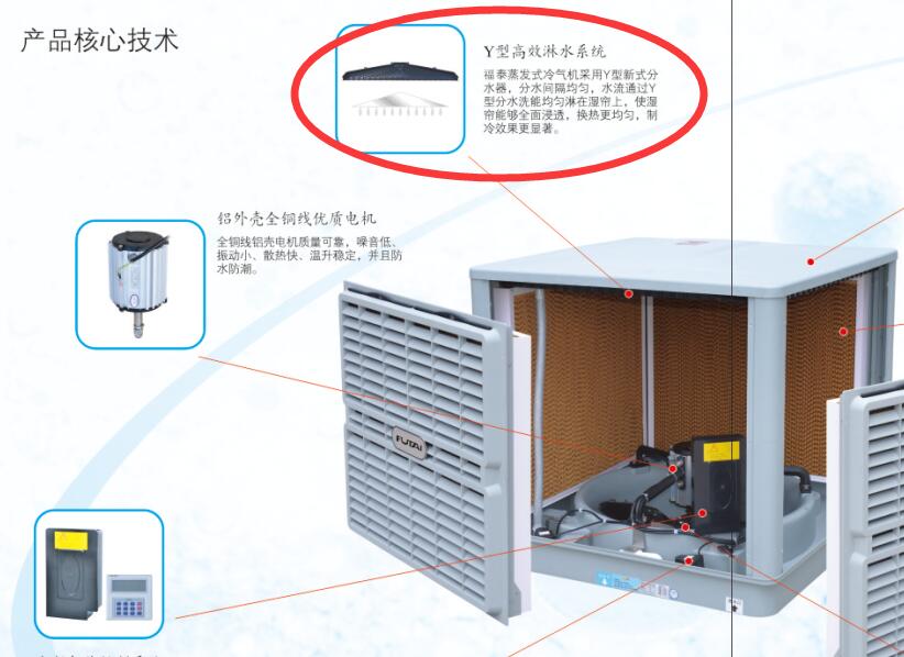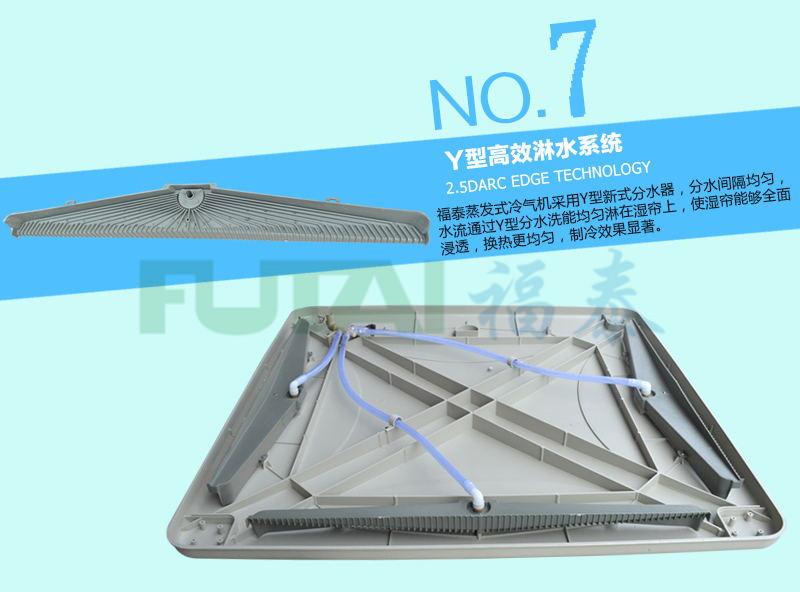 環保空調水簾噴水方式 Y型敞開式分水盤布水系統,淋水均勻暢順使節能環保空調機內水泵不間斷地抽取水槽內的凈水,通過分水器均勻地送至濕簾上。當室外空氣被強力風扇吸引經過蒸發換熱器時,空氣中的水溶性異味、粉塵雜物均被水流過濾沖刷到了水槽,高速通過濕簾的氣流強迫水迅速蒸發,從而吸收周圍大量的熱能,令氣流溫度極速下降,輸出強勁的低溫清新氣流。低溫潔凈的冷氣流由風機高壓渦盤加壓后通過管道送入室內。由于冷氣流的密度較熱氣大,故冷氣流與熱氣相遇后,迅速下沉,擠占熱氣原來的位置,熱氣被抬升到離地面3-5米的高度,而不斷進入的低溫冷氣流始終占據著空間內較低的高度,使該區域保持舒適宜人的溫度、濕度和鮮風。