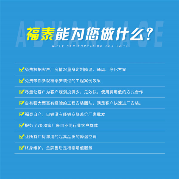 目前水冷空調(diào)和水簾風(fēng)機(jī)適用范圍:1,透用于高溫或有異味的車間:如電鍍處理廠,紡織廠,塑膠料廠,鋼結(jié)構(gòu)廠,制鞋廠皮件電鍍廠環(huán)保空調(diào),化工廠環(huán)保空調(diào)壓軸車間環(huán)保空調(diào),模具廠降溫環(huán)保空調(diào),制衣廠水簾風(fēng)機(jī),紡織車間水簾墻,服裝廠水簾風(fēng)機(jī),服裝廠濕簾墻,塑膠車間環(huán)保空調(diào),塑膠廠水簾風(fēng)機(jī),模具廠環(huán)保空調(diào),模具廠冷風(fēng)機(jī),裝配車間環(huán)保空調(diào),針織廠環(huán)保空調(diào),針織廠水簾風(fēng)機(jī),電子廠環(huán)保空調(diào),繡花水簾風(fēng)機(jī),玩具廠水簾風(fēng)機(jī),手袋廠水簾風(fēng)機(jī),鞋業(yè)廠水簾風(fēng)機(jī),注塑廠水簾風(fēng)機(jī),橡膠水簾風(fēng)機(jī)噴涂環(huán)保空調(diào),電鍍廠環(huán)保空調(diào)。五金廠環(huán)保空調(diào),印刷廠環(huán)保空調(diào),絲印廠環(huán)保空調(diào),食品加工廠環(huán)保空調(diào),漂染廠環(huán)保空調(diào),化工廠環(huán)保空調(diào),陶瓷廠環(huán)保空調(diào),電子車間降溫環(huán)保空調(diào)廠電城廠,各種化工廠福泰都服務(wù)過這種類型的廠家,你的廠房是生產(chǎn)什么的呢!期待能幫助你改善你的車間環(huán)境問題,開始我們的緣分故事也是福泰人的榮幸。 2.通用于勞動(dòng)密集型企業(yè):如服裝廠 名類裝配車間,網(wǎng)吧等地方目前福泰環(huán)保設(shè)備廠家和箭冠汽車配件廠改善車間降溫問題,箭冠生產(chǎn)汽車線束、汽車塑料連接器、注塑產(chǎn)品、注塑模具等研發(fā)生產(chǎn)的企業(yè)。 其實(shí)環(huán)保空調(diào)和水簾風(fēng)機(jī)都屬于開放式降溫,對(duì)于很多不想封閉式的廠房都適合用,而且前期投入費(fèi)用和使用費(fèi)用都很低,后期也沒有什么耗材使用費(fèi)用是很多工廠考慮選擇的前提,一個(gè)工廠既然要規(guī)劃這些降溫設(shè)備必定在費(fèi)用的評(píng)估和使用上進(jìn)行核算,換算了才會(huì)去改造的這些我們都能明白客戶的心思,所以凡是找到福泰環(huán)保空調(diào)廠家降溫通風(fēng)的客戶廠家我們都用心以少的投入成本費(fèi)用做到一個(gè)舒適的降溫效果,這樣才不辜負(fù)客戶的信任,因?yàn)槲覀兏L┛吹降母h(yuǎn)的方向幫助更多的客戶改善車間環(huán)境空氣質(zhì)量問題,幫助的客戶越多福泰的成就也越大,但一個(gè)企業(yè)以賺錢為信仰的話他可以賺到但絕對(duì)不能長久,但一個(gè)企業(yè)把這種當(dāng)成一種使命去做后也許贏得的格局更大,品牌價(jià)值是福泰人一直要做好做強(qiáng)的目標(biāo)。品牌溢價(jià)已經(jīng)不是客戶僅僅安裝一種降溫產(chǎn)品而已,而是一家專業(yè)的廠房降溫規(guī)劃一體化的服務(wù)。你不僅僅享受的是安裝了一個(gè)產(chǎn)品,更多的是細(xì)節(jié)的服務(wù)和快速的安裝以及跟蹤服務(wù)。