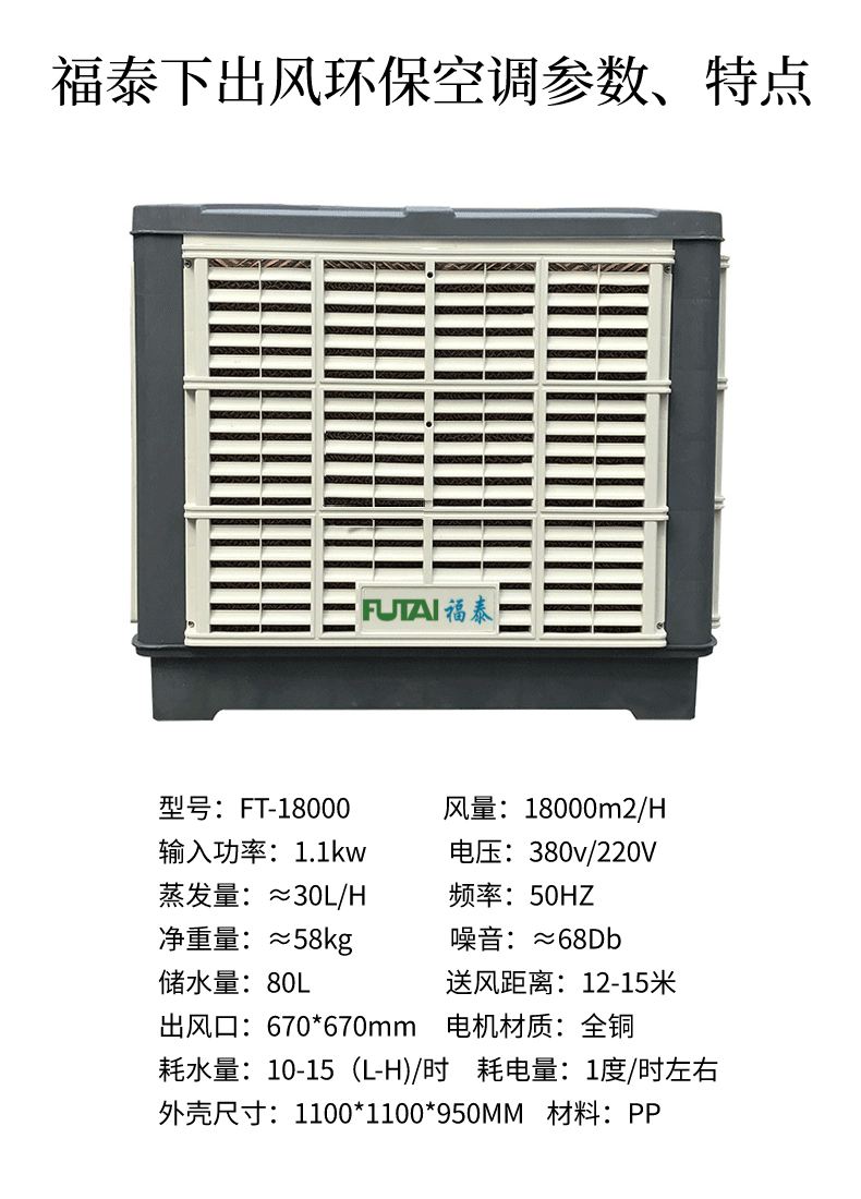福泰環(huán)保空調(diào)有哪些特點(diǎn)呢? 投資少、效能大:在同等條件及面積安裝中央空調(diào)與蒸發(fā)式冷風(fēng)機(jī)相比,蒸發(fā)式冷風(fēng)機(jī)約是中央空調(diào)總投資的1/5。 耗電少、每小時(shí)用電約1度:在同等面積安裝中央空調(diào)與蒸發(fā)式冷風(fēng)機(jī),耗電量約只需中央空調(diào)的1/8。 空氣質(zhì)量好:集通風(fēng)、換氣、除塵、降溫于一體,增加空間含氧量,提高工作效率,整體送風(fēng)或崗位送風(fēng)隨意選擇。 降溫效果強(qiáng):在南方地區(qū),一般降溫達(dá)4℃~10℃的效果,在炎熱干燥地區(qū),降溫達(dá)到4℃~15℃,并且降溫迅速。 風(fēng)量大、送風(fēng)遠(yuǎn):每小時(shí)最大風(fēng)量為20000至80000立方米,可根據(jù)客戶要求選取,風(fēng)壓大、送風(fēng)遠(yuǎn)。 性能穩(wěn)定、質(zhì)量可靠:采用100mm厚”5090蒸發(fā)濾網(wǎng)“蒸發(fā)效率高,降溫能力強(qiáng)。 調(diào)節(jié)濕度:對(duì)需要增加空氣濕度的工作場(chǎng)所進(jìn)行濕度調(diào)節(jié)。 節(jié)能環(huán)保:綠色低碳,無污染,節(jié)能環(huán)保。 FT-180A型塑膠軸流式環(huán)保空調(diào)下出風(fēng)介紹: